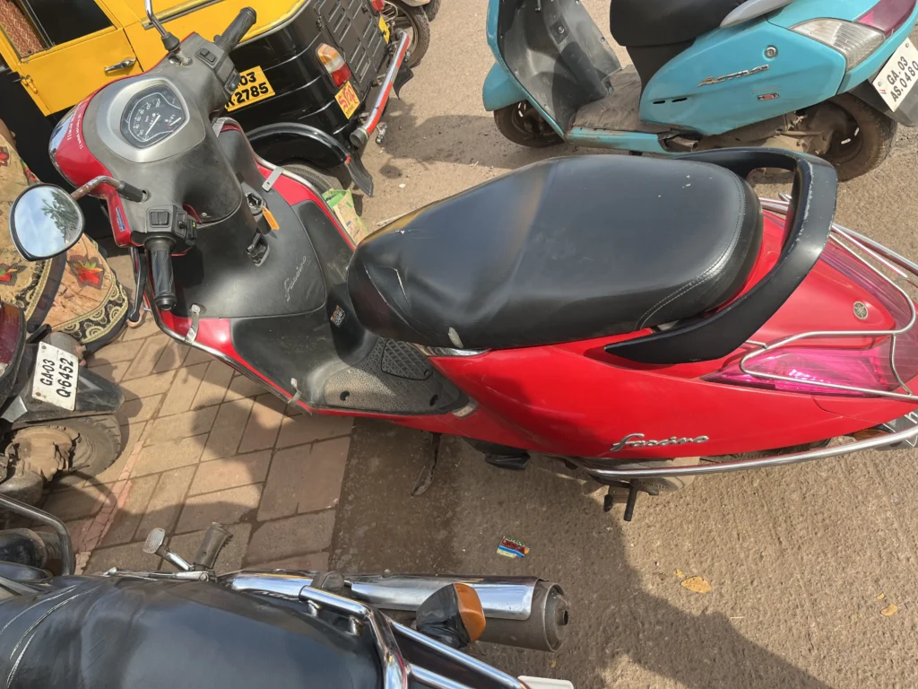 He had the vehicle parked just outside the bus stand. We walked toward it—it was a red Yamaha Fascino, a lightweight scooter that would become my reliable companion for the next few days.